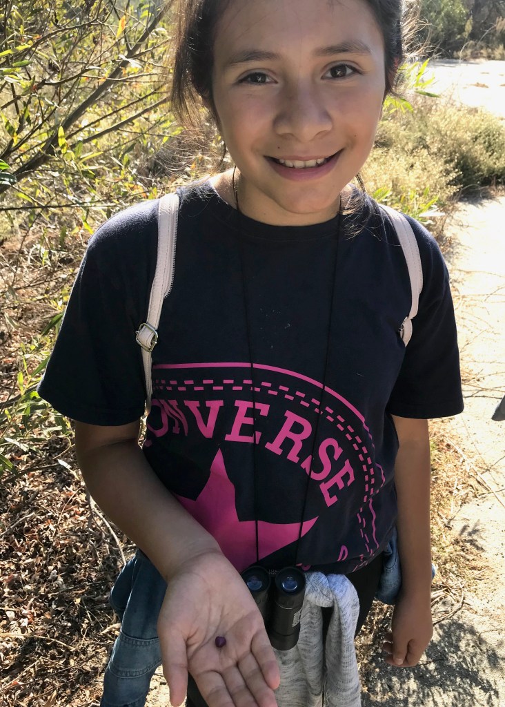 “Look! What are these?” a student asked pointing to clusters of small purple berries on a large bush, “Can we taste it?” Turns out she found a cluster of elderberries, as the kids learned by looking at the leaf shape, leaf color and plant shape. Finding out the berries are edible, the tasting commenced. “Juicy!” “Yuck!” “Sweet!” were among their conclusions. A bit further down the trail the castor bean plant was examined including learning that the seeds are the source of castor oil, an old fashioned medicine that is mildly poisonous. No tasting those!