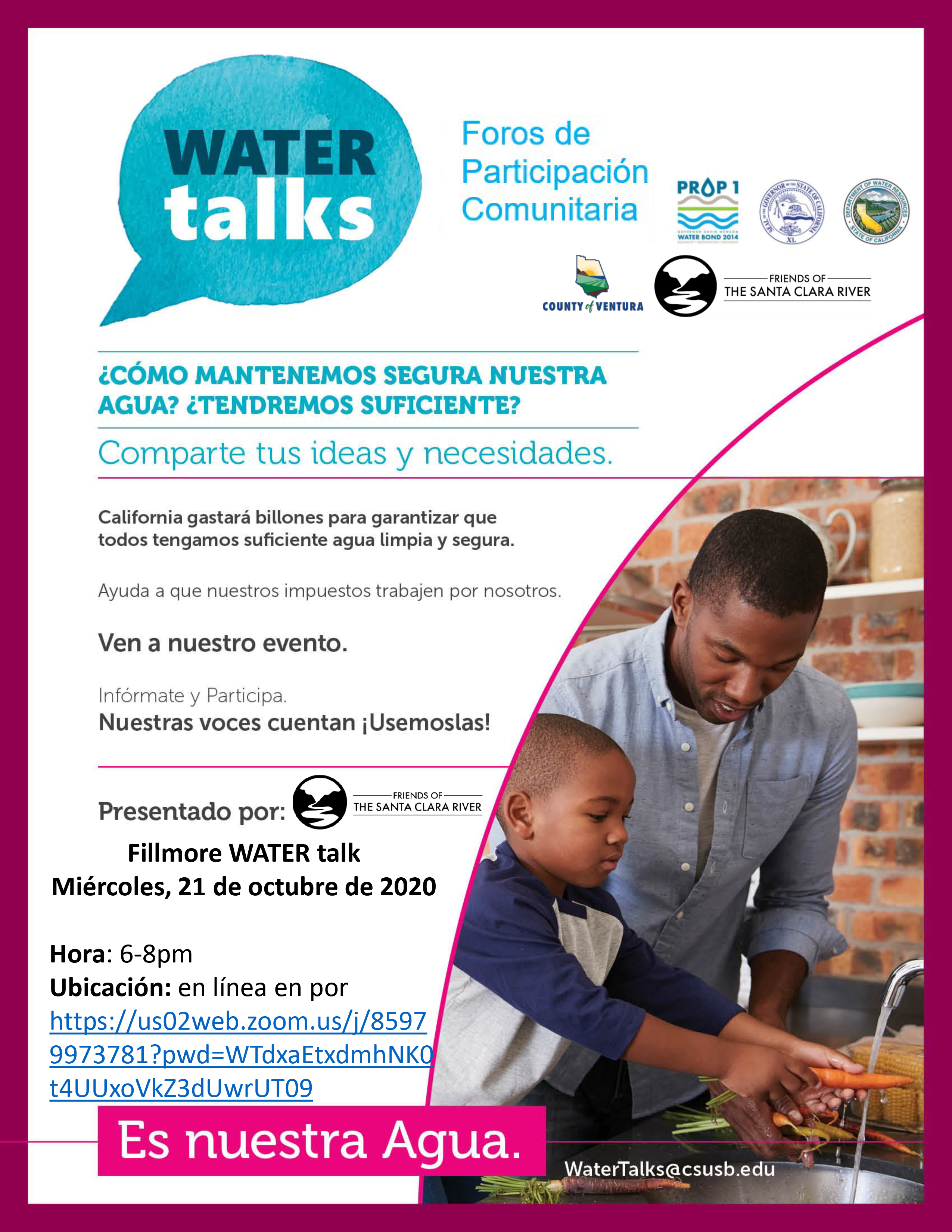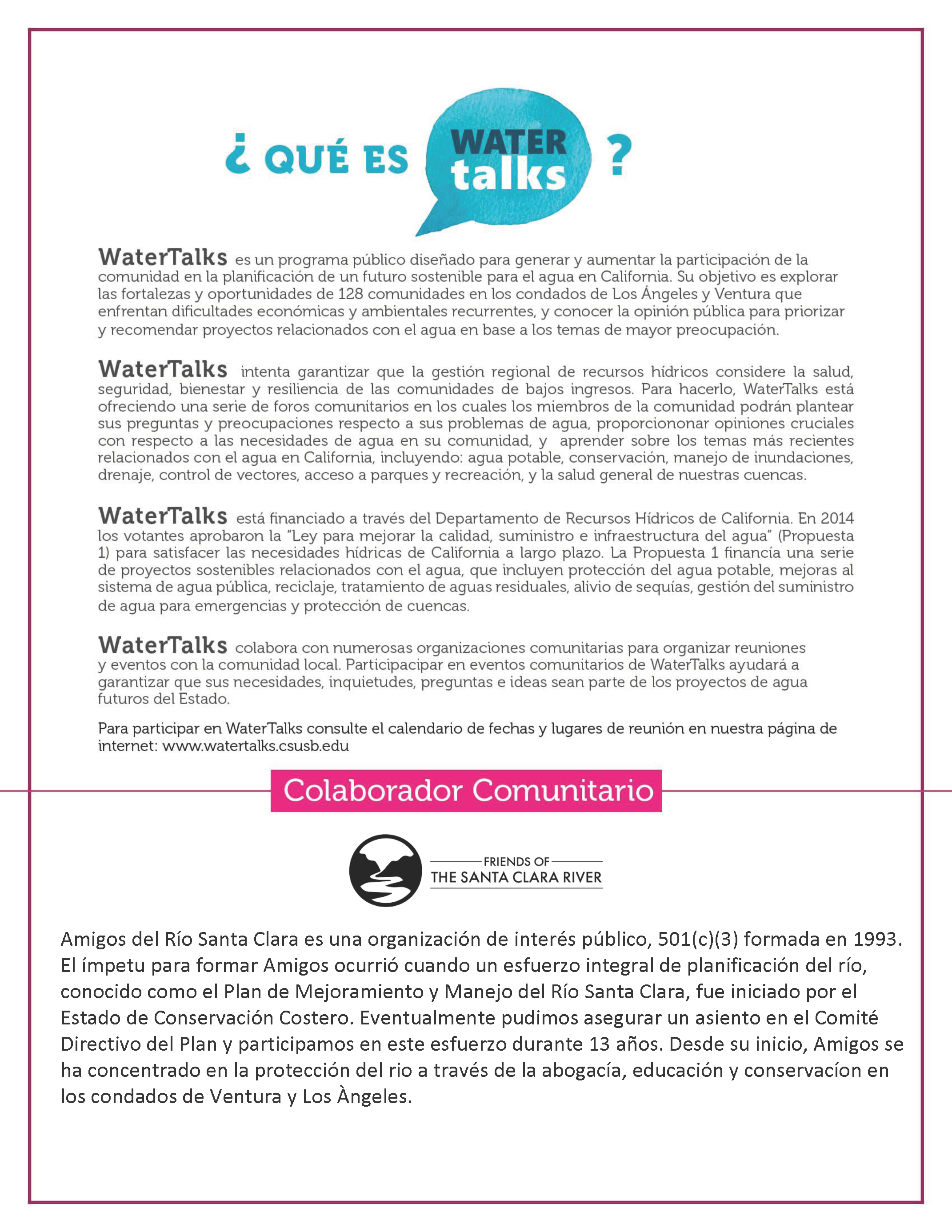 Friends of the Santa Clara River participan en dos sesiones de WaterTalks. WaterTalks intenta garantizar que la gestión regional de recursos hídricos considere la salud, seguridad, bienestar y resiliencia de las comunidades de bajos ingresos. Para hacerlo, WaterTalks está ofreciendo una serie de foros comunitarios en los cuales los miembros de la comunidad podrán plantear sus preguntas y preocupaciones respecto a sus problemas de agua, proporciononar opiniones cruciales con respecto a las necesidades de agua en su comunidad, y aprender sobre los temas más recientes relacionados con el agua en California, incluyendo: agua potable, conservación, manejo de inundaciones, drenaje, control de vectores, acceso a parques y recreación, y la salud general de nuestras cuencas.